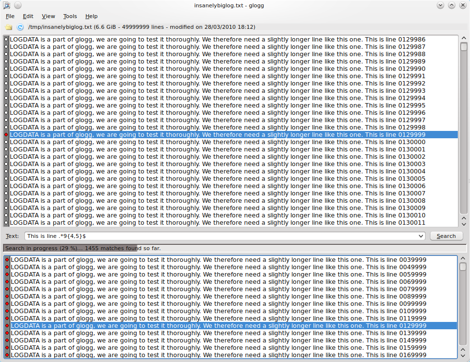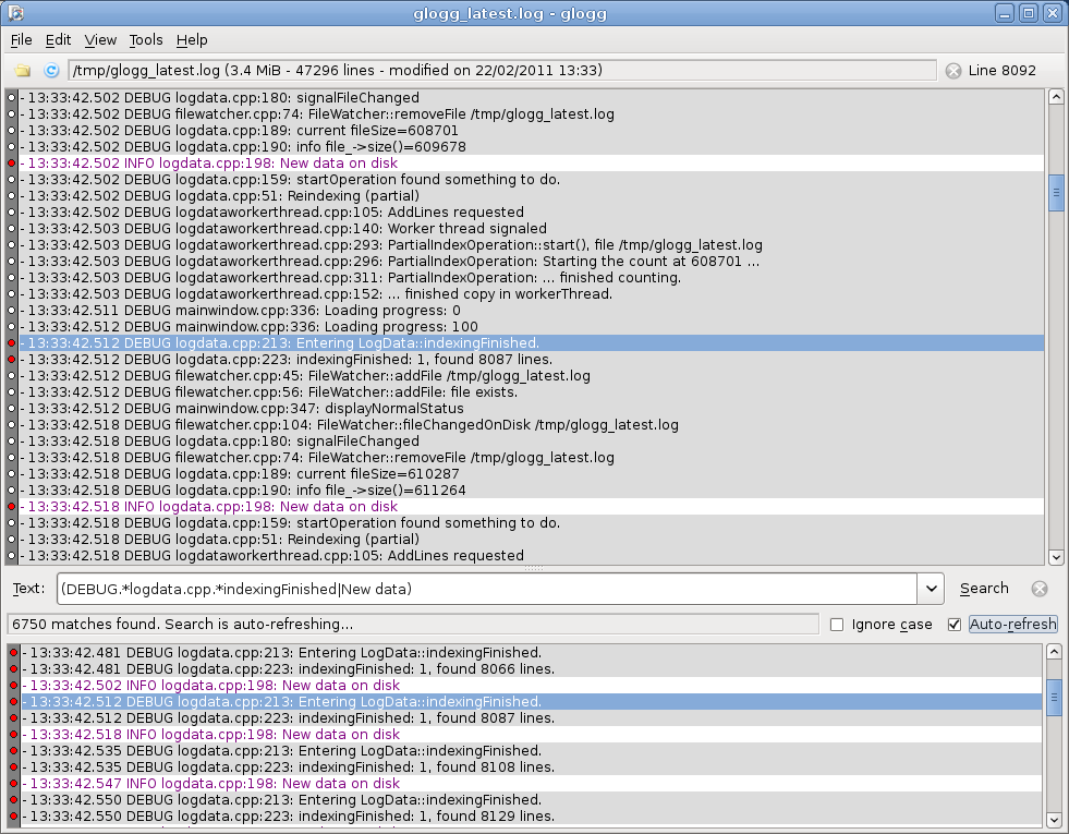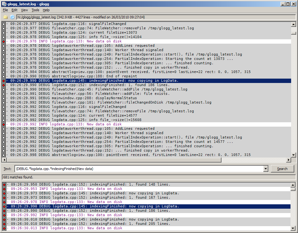 | glogg 0.6 displaying it's own log on WinXP | Searching through a respectably sized log on Kubuntu 9.10 |