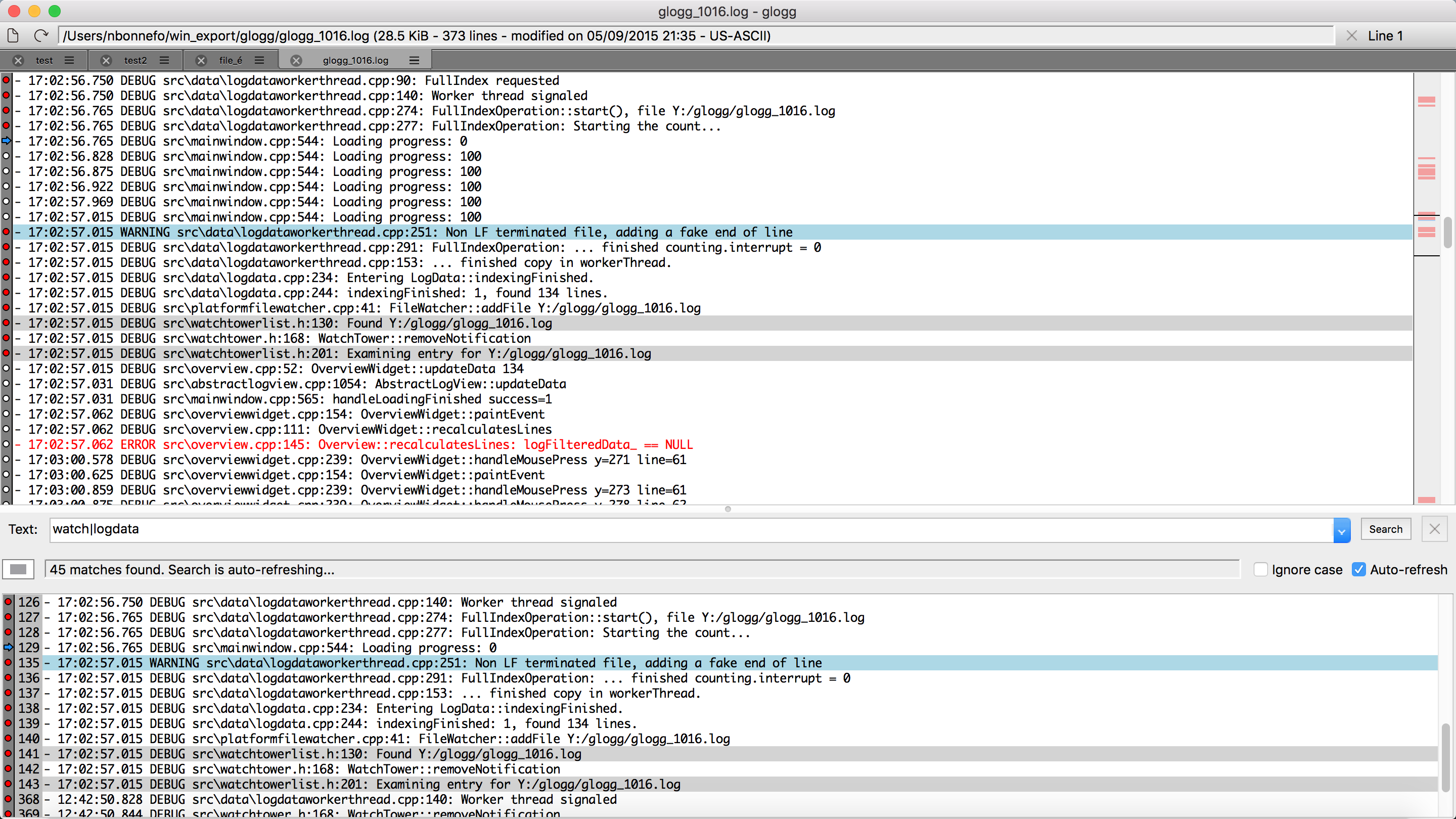 | glogg 1.1.2 on Mac OSX 10.11 and a high resolution display | glogg 0.8.3 on Debian sid |